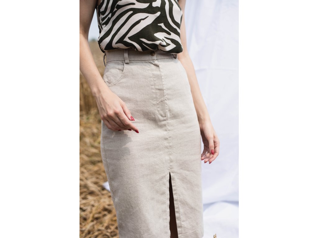 Sukně s elegantní délkou pod kolena s klasickým kalhotovým zapínáním, kapsami a poutky na pásek